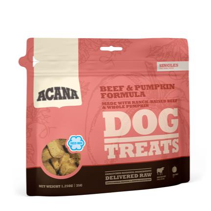 Dogs are carnivores no matter how big or small, so reward them like one! Acana's Beef & Pumpkin Dog Treats blend 100% raw beef ingredients (including meat and organs) and fiber-rich pumpkin, to create a yummy, wholesome reward! Perfect to use as a training treat or simply a healthy snack!