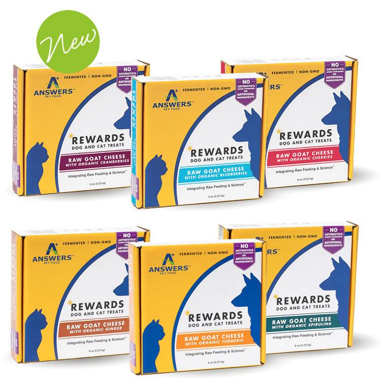 Rewards Raw Goat Cheese Treats from Answers are low calorie goodness with 1 billion probiotics per treat! Organically raised, grassfed, raw goat cheese with added superfoods - only 2 ingredients - provide protein, healthy fats and probiotics. Your pet will love them!
