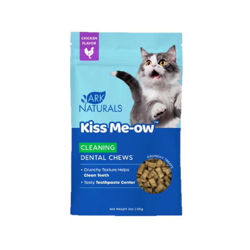 Give your pretty kitty a tasty treat and enjoy better smelling breath and cleaner teeth with Ark Naturals' Kiss Me-Ow Chicken Cleaning Dental Chews! Made with a delicious toothpaste center, these chews are a 4-in-1 crunchy dental treat. Cats will love the chicken flavor of these scrumptious chews, and pet parents will love that these chews clean your pet's teeth and helps to reduce plaque and tartar. With teeth so clean, you'll be giving your fur baby non-stop kisses! Net wt. 3 oz
