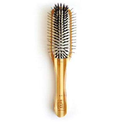 Keep your dog's hair looking it's best with the Bass Rectangle Wire and Boar Palm Style Grooming Brush by Bass Brushes. Metal pins are closely set and work to detangle hair and remove particles and the natural boar bristles distribute the natural oils in your dog's coat, leaving it soft and shiny. You and your dog will both enjoy a smoother grooming session.