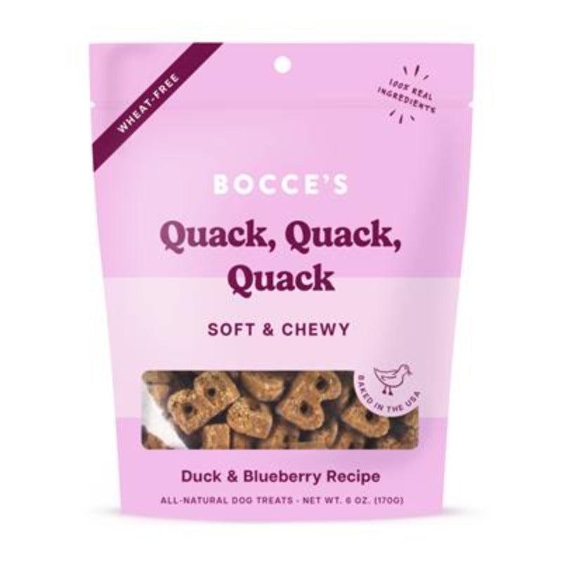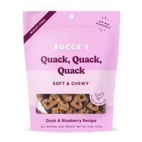One look at the ingredients and you'll see why these are a doggie favorite! Bocce Bakery's Quack, Quack, Quack Soft & Chewy Treats are delicious savory duck treats with antioxidant-rich blueberries in a delightful recipe your dog can't resist. 100% real ingredients, wheat-free and made in the USA. Stock up and always have on hand for treats or training. Net wt. 6 oz.