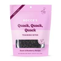 Perfectly sized for training sessions, Bocce Bakery's Quack, Quack, Quack Training Bites are delicious savory duck treats with antioxidant-rich blueberries in a delightful recipe your dog will do tricks for! 100% real ingredients, wheat-free and made in the USA. Stock up fill your treat bag or jar so you always have on hand for treats or training. Net wt. 6 oz. Made in the USA.