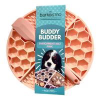 Turn treat time into a calming enrichment session with the Bark Bistro Buddy Budder Enrichment Mat in pink! This 8" x 8" BPA-free silicone mat helps slow down snacking, ease anxiety through licking, and keep pups happily occupied. It even comes with a handy spatula for smooth, mess-free spreading of their favorite soft treats.
