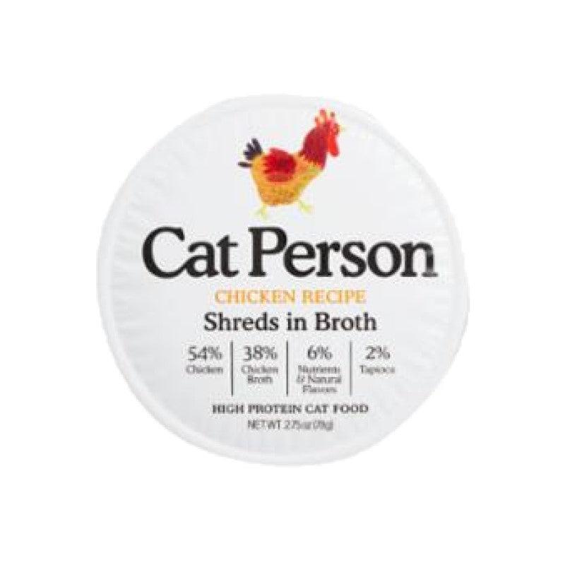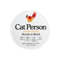 Cat Person Shreds in Broth Chicken recipe provides a complete and nutritious meal to keep your cat healthy and hydrated. 2.75 oz. cup.