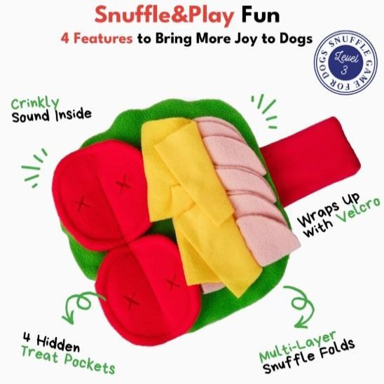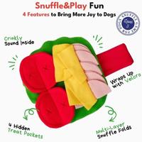 Unwrap the fun! The Chewffon Burrito Snuffle Toy is a cleverly crafted interactive toy that mimics a rolled-up burrito—complete with crinkly lettuce, squeaky tomato slices, and hidden treat pockets tucked inside its cozy fleece folds.