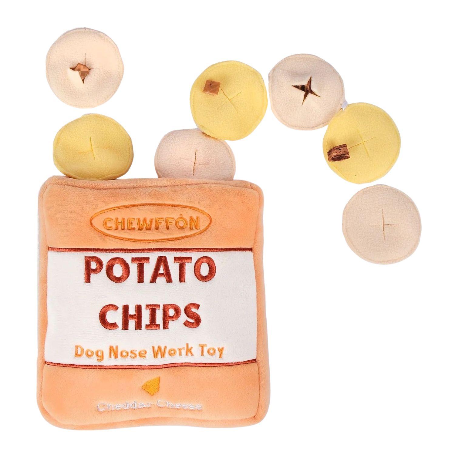 The Chewffon Rustle Potato Chips Dog Snuffle Toy is a crinkly, crunchy, treat-hiding plush that brings snack-time fun to your pup’s playtime. Designed to look like a classic bag of chips—complete with squeaky “chips” inside—it’s a sensory-rich enrichment toy that satisfies your dog’s natural sniffing instincts.