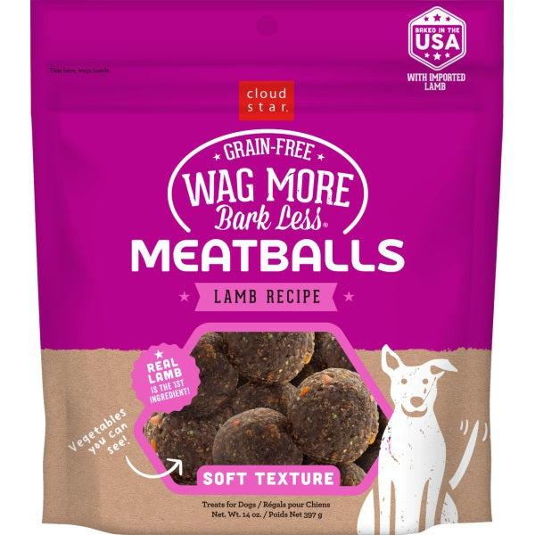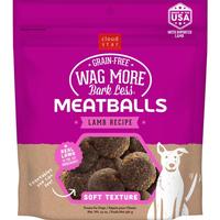 Savory lamb and veggie meatballs are perfect for treating your special dog! Wag More Bark Less Lamb Recipe Meatballs from Cloud Star are delicious limited ingredient treats with a delicious lamb flavor your dog will love. Grain free, no added gluten, no corn, wheat, soy, animal by-products, artificial colors or flavors. Make room on the treat shelf, these will be a favorite with your pet. Net wt. 14 oz. Made in the USA.