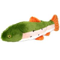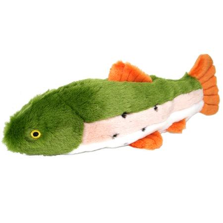 Wade on down to the plush rivers of imagination to find Ruby the Rainbow Trout from Fluff and Tuff dog toys! Ruby is a not-at-all red not-at-all scaley plush fish. Her fuzzy, super-soft ultra-plush outside is a pretty green, orange, and white with black speckles and sunshine-yellow eyes.