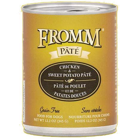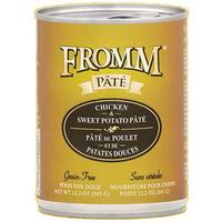 Indulge your dog's palate with Chicken & Sweet Potato Pate by Fromm! Every can has bite after velvety bite of finely minced American-raised chicken cooked in chicken broth with sweet potatoes, lentils, and carrots. It's the tastiest way to give your pup an extra nutritious boost of moisture in their diet! There are no grains, added hormones, or byproducts. Every recipe is 100% made in the USA and can be swapped with other varieties of Fromm without causing havoc to the digestive system, so be sure to try every delicious flavor we have to offer! Available in 12 oz can. Made in the USA.