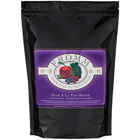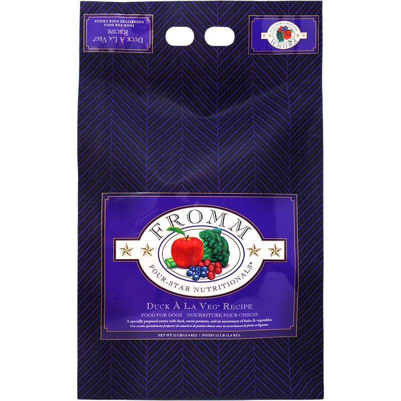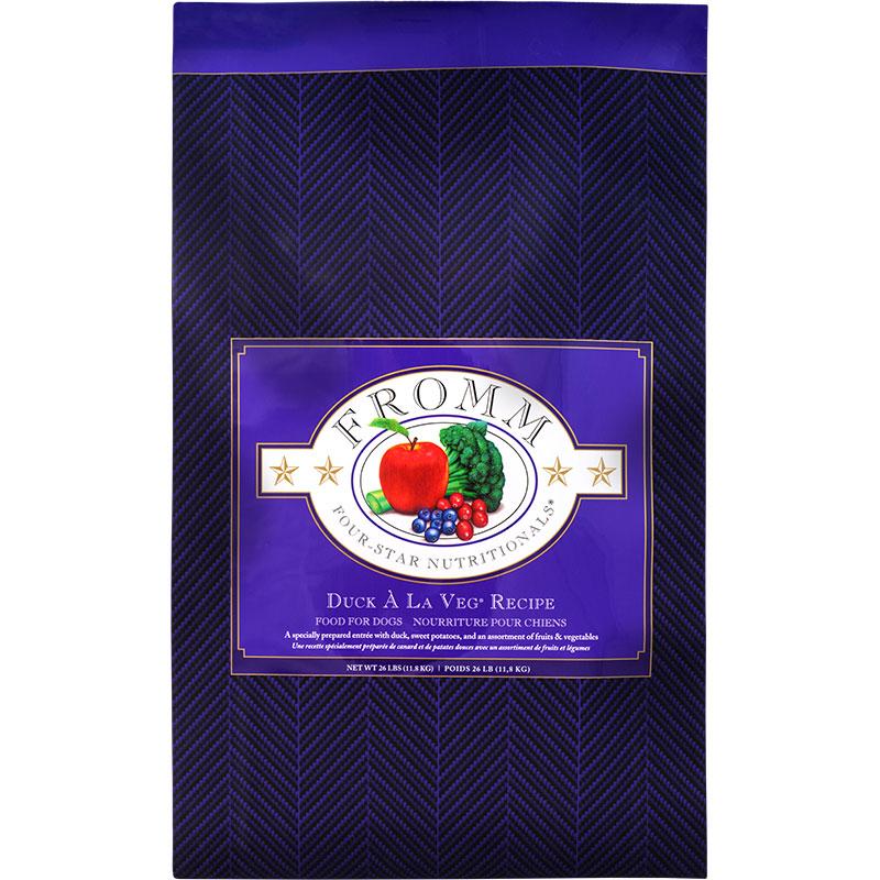 Fromm Four Star Nutritionals Duck A La Veg Formula is a grain inclusive dry dog food that features the benefits of a wide array of fruits and vegetables. With duck as the first ingredient your dog will gobble up this flavor favorite! The Duck A La Veg formula is one of the many flavors offered in the Four Star line, and a perfect protein for dogs with allergies to beef or chicken! Tasty duck will nourish your dog with biologically appropriate protein. This kibble contains added taurine for heart health and probiotics for digestion support! Fromm is a fifth generation, family owned company from Wisconsin and they make kibble like this with your dog in mind!