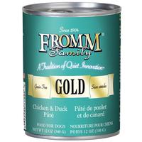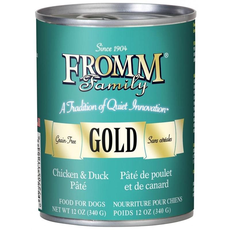 Indulge your dogs palate with Gold Chicken & Duck Pate by Fromm! Every can has bite after velvety bite of finely minced American-raised chicken and duck cooked in chicken broth with carrots, peas, and potatoes. Its the tastiest way to give your pup an extra nutritious boost of moisture in their diet! There are no grains, added hormones, or byproducts. Every recipe is 100% made in the USA and can be swapped with other varieties of Fromm without causing havoc to the digestive system, so be sure to try every delicious flavor we have to offer! Available in 12 oz can. Made in the USA.