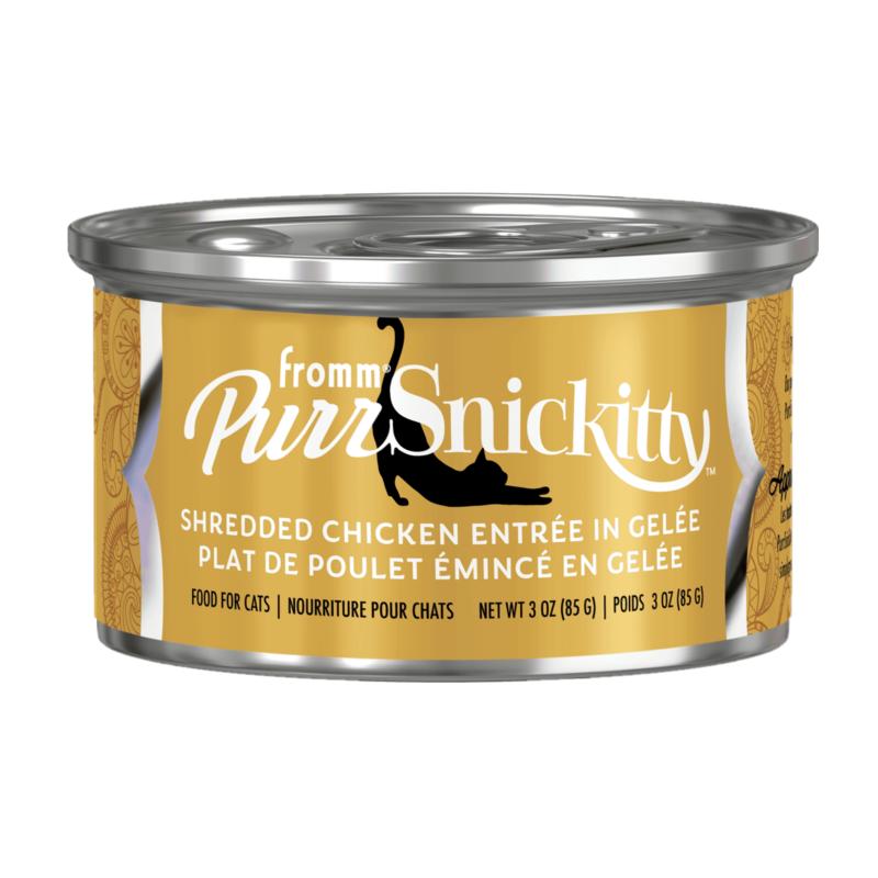 Fromm PurrSnickitty™ Shredded Chicken Entrée in Gelée is a tender, moisture-rich indulgence for cats who crave texture and taste. Net wt. 3 oz. Made in the USA.