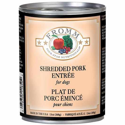 Give your dog a hearty meal with Fromms Four-Star Nutritional's Shredded Pork in Gravy Entree! Every can has generous portions of All-American shredded pork cooked in pork broth with beans, potatoes, and carrots. Its the tastiest way to give your pup an extra nutritious boost of moisture in their diet! There are no grains, added hormones, or byproducts. Every recipe is 100% made in the USA and can be swapped with other varieties of Fromm without causing havoc to the digestive system, so be sure to try every delicious flavor we have to offer!