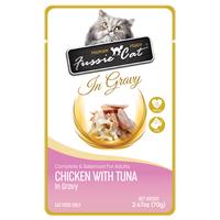 Fussie Cat's Chicken with Tuna in Gravy Premium Pouches are convenient and oh, so delicious! Carefully crafted with succulent chicken and tuna in a savory gravy, this complete and balanced wet food will win over even the finickiest of felines. Designed with your kitty's needs in mind, this mouthwatering formula includes Omega-3 fatty acids and DHA for skin, coat, brain, and eye support. Plus, its high moisture content means your favorite feline gets the extra hydration their body needs. And, thanks to the pouch design, simply tear it and pour out your cat's new favorite food. Delicious from start to finish, this wet food will take mealtime to the next level!