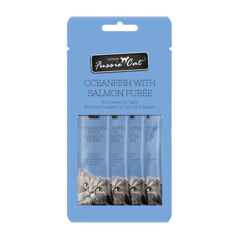 Ocean Fish with Salmon Puree Cat Treat Food Topper from Fussie Cat is a delicious combination that is sure to catch your kitty's attention. Irresistibly creamy and delicious, this hydrating treat is perfect for finicky felines. Convenient individually-wrapped tubes contain wholesome ingredients with added vitamin E, perfect as a food topper, smeared on licki-mats or straight out of the tube! A paw-licking delight your cat will love!