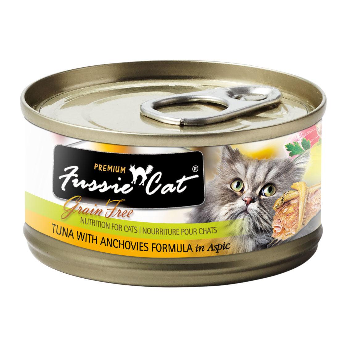 Your feline will love the fine fish in this formula! Fussie Tuna With Anchovy in Aspic is for those fussy cats with picky tastes. In this canned formula for cats there is healthy prebiotics to help keep your cat's digestive system in tip top shape. It keeps the good and bad bacteria balanced to prevent and treat diarrhea, constipation, and other bowel disorders. The Fussie Tuna With Anchovy in Aspic contains only the best cuts of tuna and anchovy for your cat. Plus this formula is grain free! So encourage a healthy digestive system in your cat with the Fussie Tuna With Anchovy in Aspic! Available in 3 oz & 5 oz sizes.