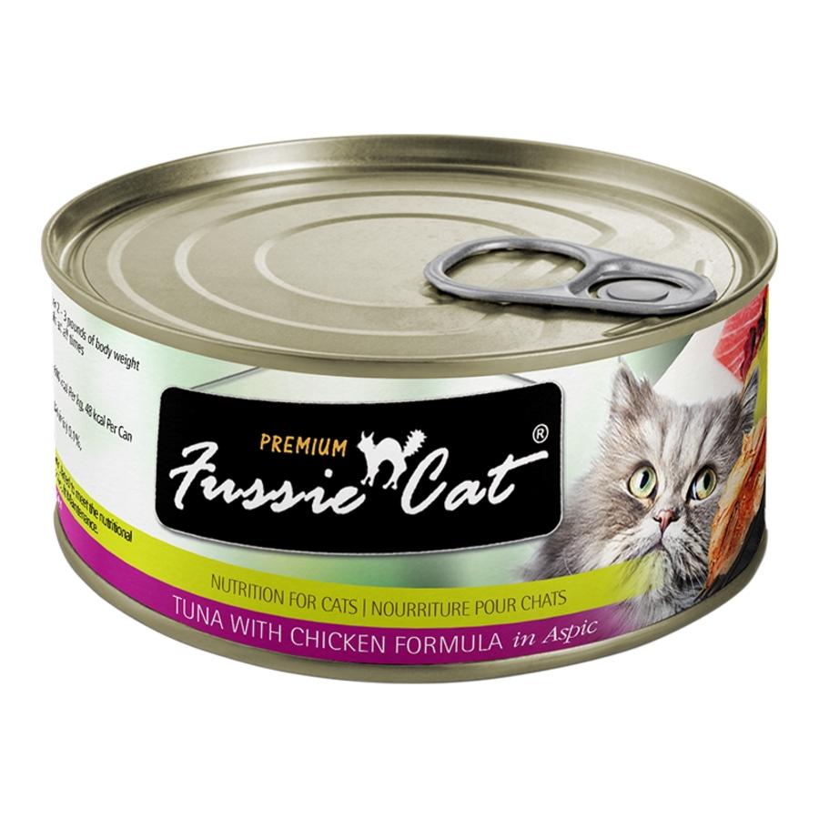 Your feline will love the fine fish and fowl in this formula! Fussie Tuna With Chicken is for those fussy cats with picky tastes. In this canned formula for cats there is healthy prebiotics to help keep your cat's digestive system in tip top shape. It keeps the good and bad bacteria balanced to prevent and treat diarrhea, constipation, and other bowel disorders. The Fussie Tuna With Chicken contains only the best cuts of tuna and chicken for your cat. Plus this formula is grain free! So encourage a healthy digestive system in your cat with the Fussie Tuna With Chicken! 3 Oz and 5 Oz sizes.