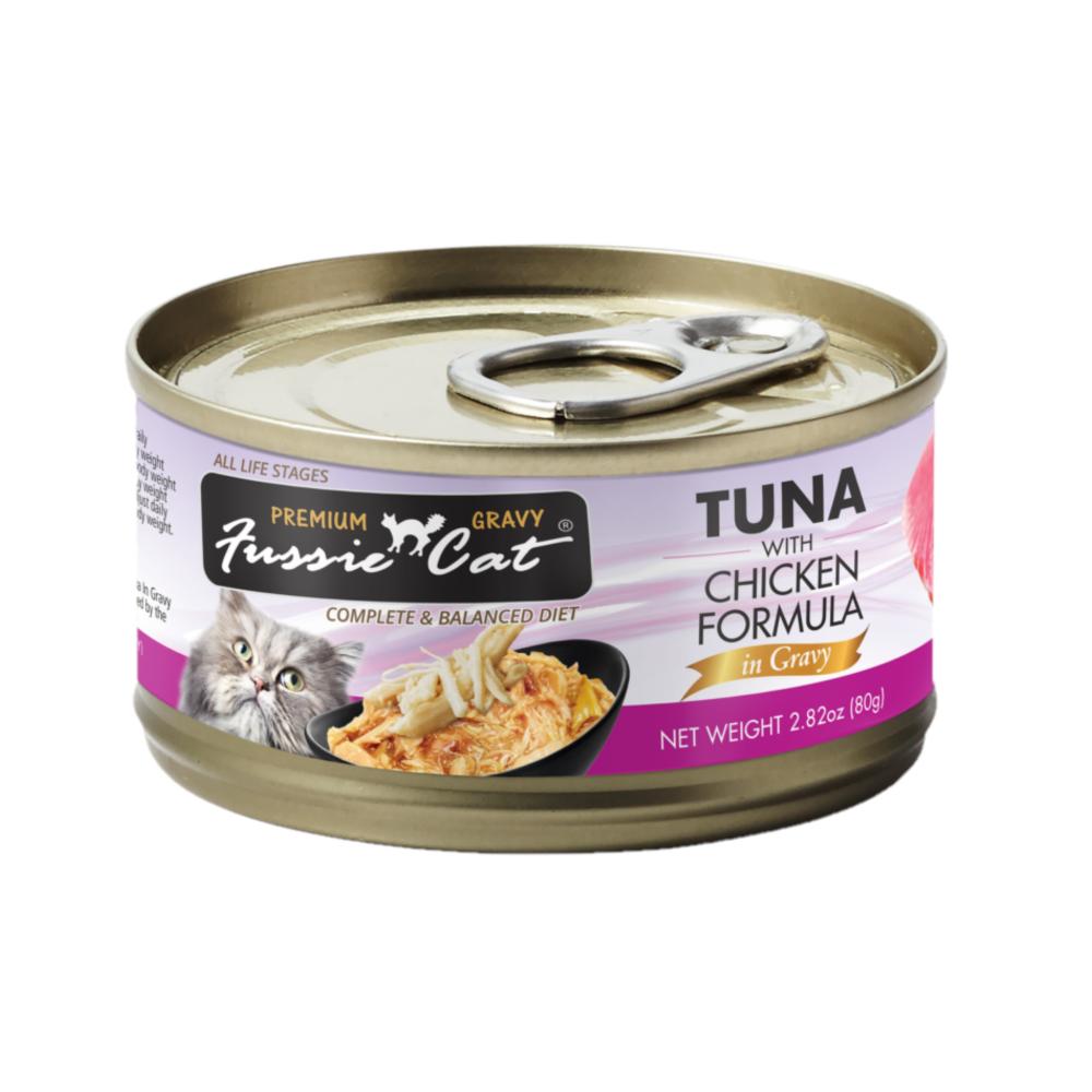 Even the pickiest of kitties will love Fussie Cat's new Tuna with Chicken Formula in Gravy! This mouthwatering recipe features shreds of tuna and chicken in a hydrating gravy for a complete and balanced food your feline will adore. Rich in DHA and packed with vitamins and minerals, this wholesome formula adds an extra boost of brain and vision support to your cat's diet. Your little carnivore won't be able to get enough of this gourmet cat food!