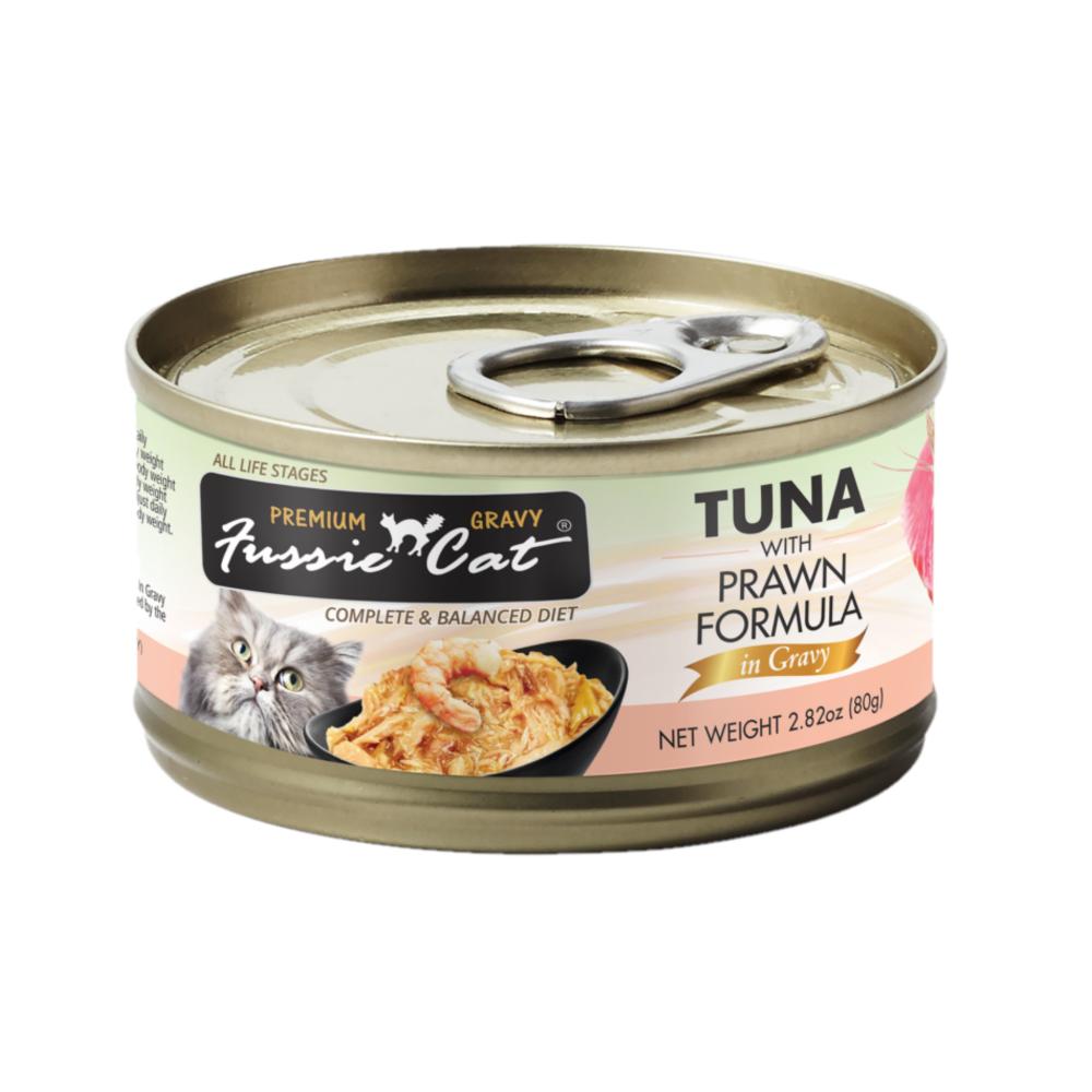 Fussie Cat's Tuna with Prawn Formula in Gravy is perfect for seafood-loving felines! This complete and balanced gourmet cat food features succulent shreds of tuna and whole prawns in a savory gravy for the extra hydration your kitty needs. Rich in DHA, vitamins, and minerals, this wholesome formula adds extra brain and vision support to your cat's diet. With so much to love, choosing this paw-lickin' recipe is a breeze!