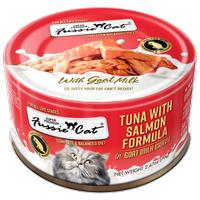 When in doubt, serve your kitty Fussie Cat's new Tuna with Salmon Formula in Goat Milk Gravy! This complete and balanced gourmet cat food features succulent bites of tuna and salmon all served in a creamy gravy for the added hydration your feline needs. And, since this formula is rich in DHA, vitamins, and minerals, your cat gets a little extra brain and gut support. Made with your furball's needs in mind, there's just no beating this mouthwatering recipe!