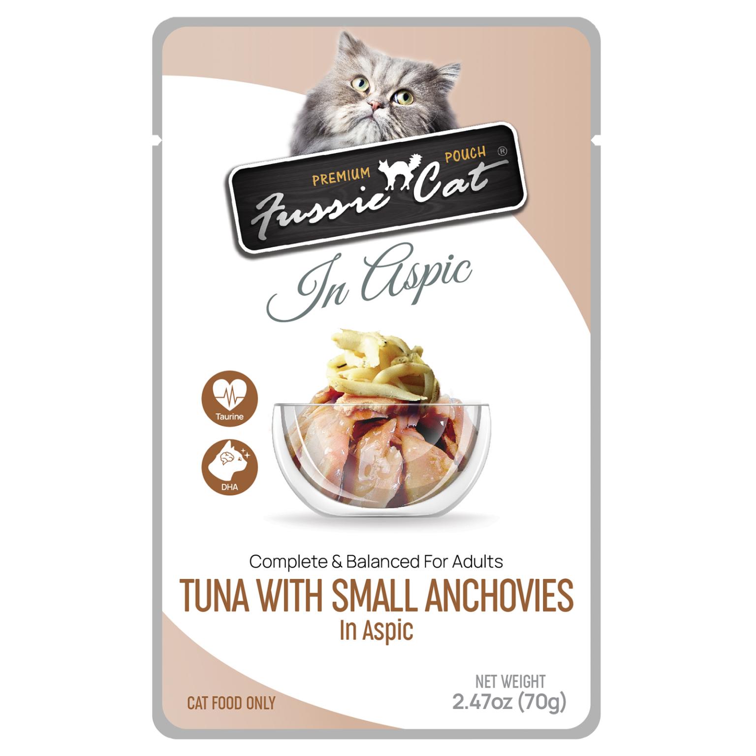 Delicious and easy to feed, Fussie Cat's Tuna with Small Anchovies in Aspic Premium Pouches is the perfect wet food for your kitty! Carefully crafted with a delicious blend of tuna and anchovies, this moisture-rich formula ensures that your furball gets the hydration their body needs. This wholesome recipe is also made with DHA and Omega-3 fatty acids so they get an extra boost to their skin, coat, brain, and vision health. And, with its convenient pouch design, mealtime just got even easier! When it comes to wet food, this flavorful formula is just what your feline friend has been looking for!