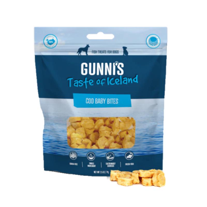 Treat your pooch to a protein-packed treat they'll love with the Cod Baby Bites from Gunnis! Made in Iceland with 100% sustainably caught cod, these treats may be small but they're full of fishy goodness. And, thanks to their size and light and crunchy texture, they're perfect for training and traveling! So delicious, your pup will be begging for more!