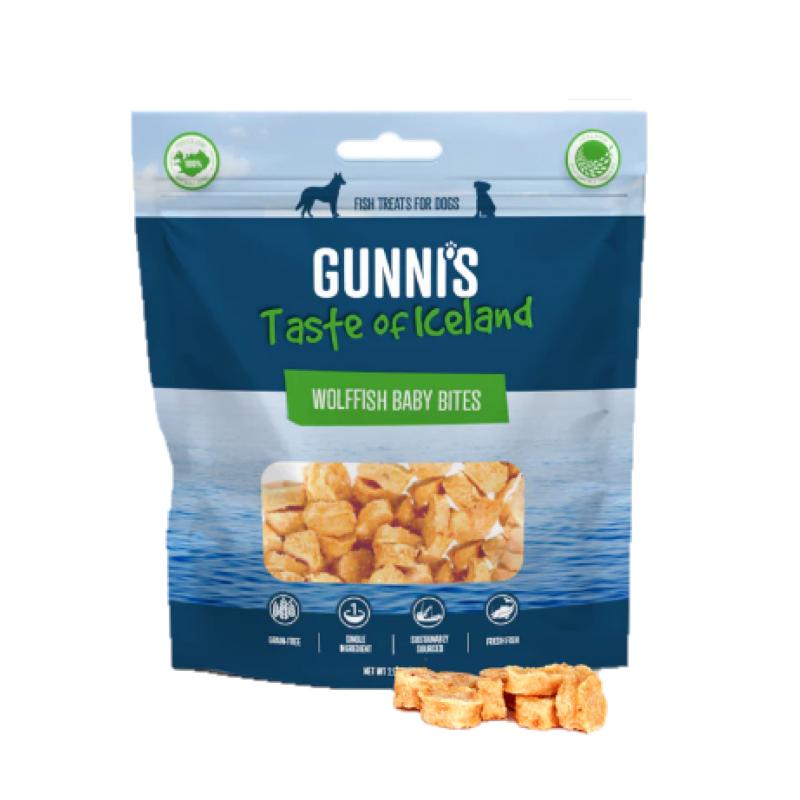 Gunnis' Wolffish Baby Bites may be small but they're full of flavor! Made in Iceland with 100% sustainably sourced wolffish, these treats are packed with protein. And thanks to their small size and light and crunchy texture, they're perfect for training or traveling! Simple and delicious, these wholesome treats are sure to leave your pup's mouth watering!