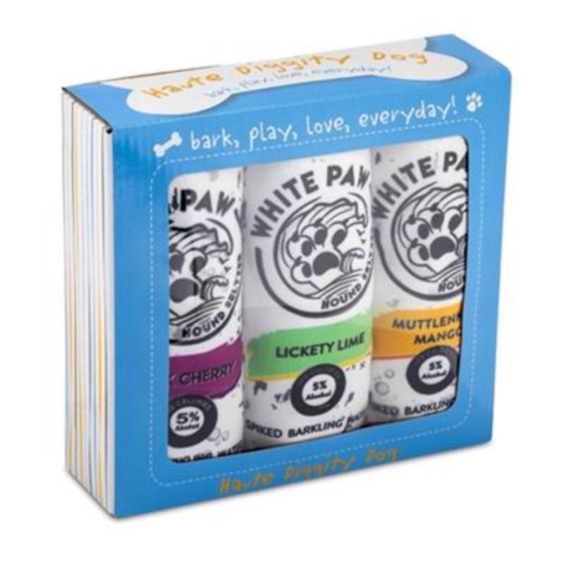 Triple the fun with White Paw Hound Seltzer Boxed Set. Your pup will love getting their paws on these fun plush toys from Haute Diggity Dog! The set includes three of the most popular Seltzer: Bark Cherry, Lickety Lime, and Muttlenial Mango! Fun toys with an easy to grab shape and a fun squeaker to catch and hold your pup's attention. Perfect for stimulating games of fetch and catch!
