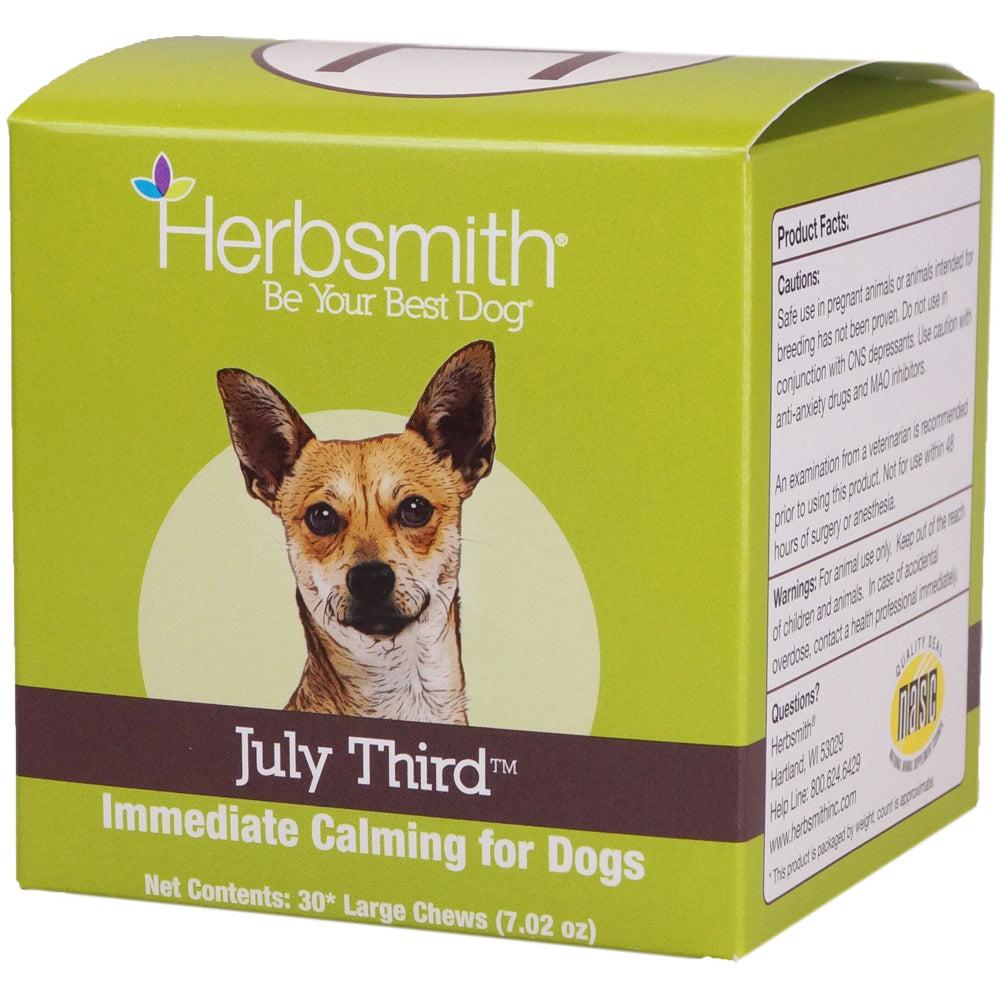 Have a dog that gets nervous, hyperactive, or clingy in situations like fireworks, travelling, company, or thunderstorms? July Third from Herbsmith is the perfect combination of Chamomile, Tryptophan, Passion Flower, and Valerian to help ease the anxiety and make these moments much more enjoyable for you and Fido! 30 count.