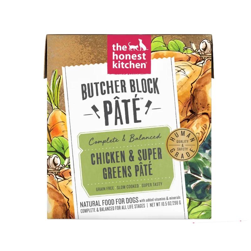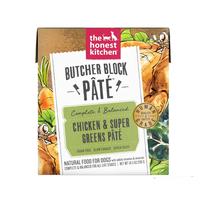 NEW! Butcher Block Pâtè Chicken & Super Greens Recipe Dog Food from Honest Kitchen is a delicious, savory, hearty meal your best canine buddy will love! Full of protein-rich cage-free chicken (all meat is hormone and antibiotic free) and fortified with super greens kale and spinach! Honest Kitchen doesn't skimp on quality ingredients. Their recipes are 100% human grade whole foods with no by-products, no preservatives, no corn, wheat, soy or GMO ingredients - just healthy, wholesome goodness like you'd make at home. Convenient package makes it easy for travel, pet sitters, and quick meal prep at home. Perfect as a complete and balanced meal, or a tasty topper. This delicious recipe is going to be a new favorite with your dog - better stock up! Net wt. 10.5 oz box.