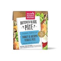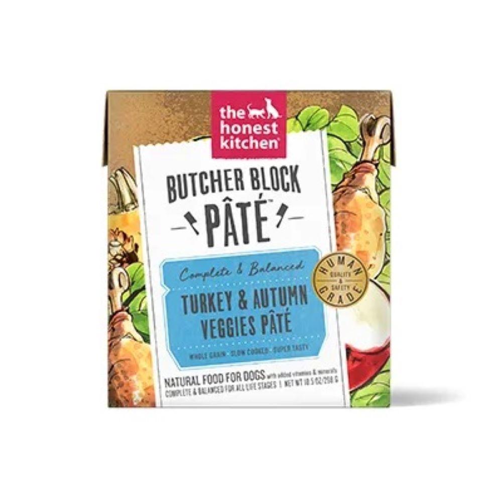 NEW! Butcher Block Pâtè - Turkey & Autumn Veggies Recipe Dog Food from Honest Kitchen is a delicious, savory, hearty meal your best canine buddy can enjoy year-round! Full of protein-rich cage-free turkey (all meat is hormone and antibiotic free) and fortified with spinach and autumn produce like apples and pumpkin! Honest Kitchen doesn't skimp on quality ingredients. Their recipes are 100% human grade whole foods with no by-products, no preservatives, no corn, wheat, soy or GMO ingredients - just healthy, wholesome goodness like you'd make at home. Convenient package makes it easy for travel, pet sitters, and quick meal prep at home. Perfect as a complete and balanced meal, or a tasty topper. This tasty recipe is going to be a new favorite with your dog - better stock up! Net wt. 10.5 oz box.