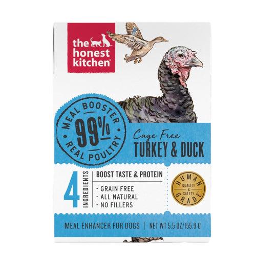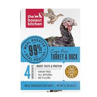 Let's get honest about dog foodkibble is kind of bland! 99% Turkey and Duck Meal Booster topper by The Honest Kitchen is a nutritious and delicious meal booster. Enhance your dog's bowl with this human grade stew to add flavor variety and extra protein. Made with three ingredients and no added hormones or antibiotics, you can feel good about giving your dog this meat protein booster! Not only are you adding savory flavor, you are adding extra moisture, which is good for your dog's overall health.