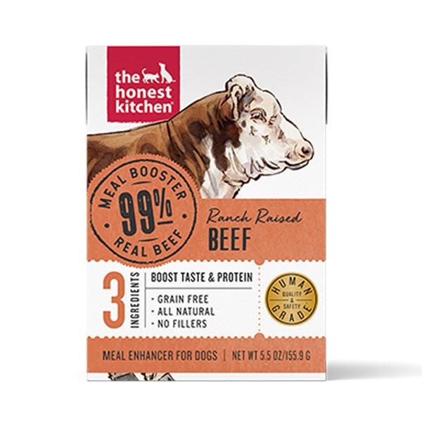 Supercharge your pet's meal with this 99% Beef Protein Booster topper from The Honest Kitchen! A flavorful way to entice picky eaters, combining savory taste and aroma, not to mention additional nutrition and moisture! Made with 3 ingredients, and without corn, wheat, soy, GMOs, grains, added hormones, or antibiotics. 100% human grade, ranch-raised beef. Comes in 5.5 oz. Made in U.S.A.