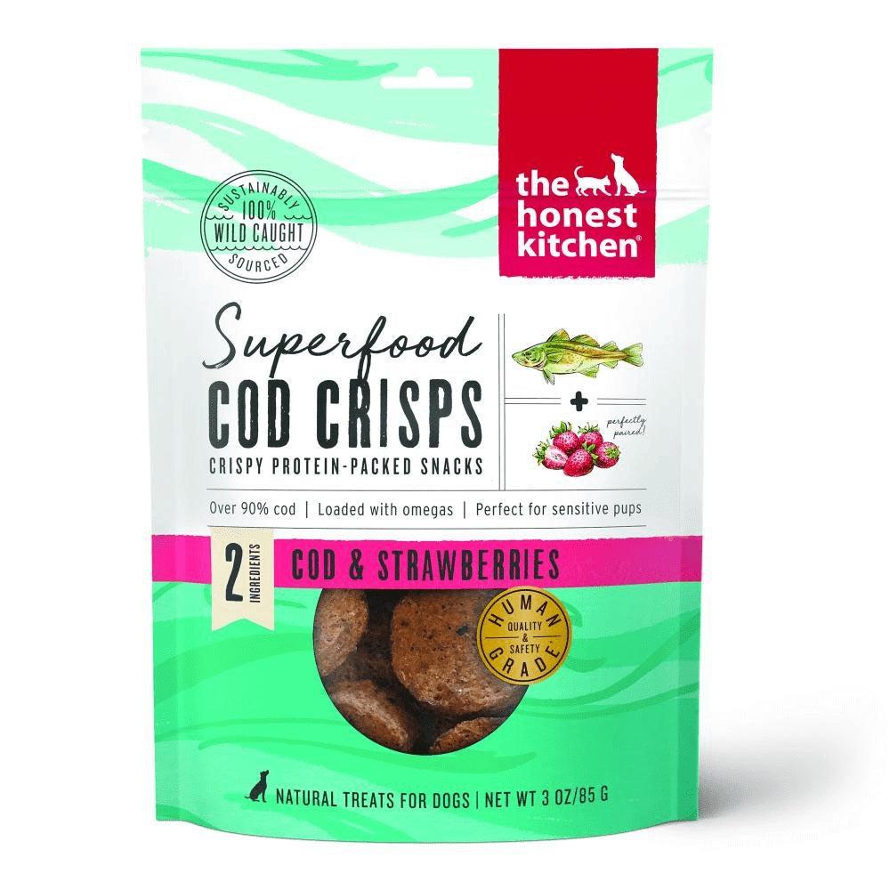 New from Honest Kitchen these Superfood Cod Crisps are 2 simple ingredients - Icelandic Cod and juicy strawberries! Loaded with lean protein and anti-oxidant rich strawberries these aromatic and crunchy snacks can be broken into smaller pieces for training, or given as a whole treat for a special good dog!