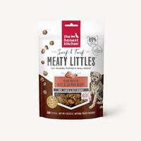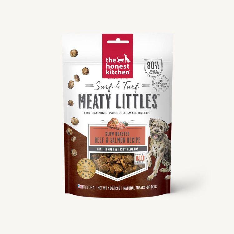 Savory and delicious Surf & Turf Meaty Littles from Honest Kitchen are a scrumptious land and sea treat your dog will love! Made with ranch raised beef and wild caught salmon, these high protein treats are perfect for training or use as a high reward treat. With extra protein to provide muscle support and DHA for brain health. This recipe contains no preservatives, by-products, fillers, GMO ingredients, corn, wheat or soy. Slip these into your treat bag or jar to have a doggy favorite always handy. Net wt. 4 oz.