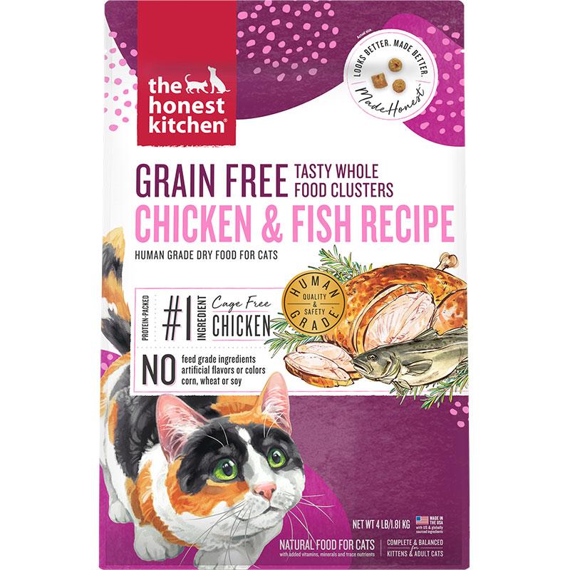 The Honest Kitchen Grain Free Chicken & Whitefish Clusters Dry Cat Food is nutritious and delicious! Your favorite feline will love this savory land and sea recipe, 100% human grade dry cat food is made with cage-free chicken and wild caught fish, whole foods and a boost of probiotics to help support digestion. Made in the USA with no artificial preservatives, feed grade by-products, fillers, GMO ingredients, corn, wheat or soy.