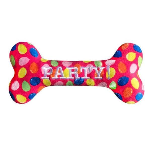 Celebrations are fun for everyone! Lulubelles Power Plush Party Time Pink Bone is a colorful and fun bone-shaped squeaky plush toy perfect for celebrating birthdays, gotcha days and training graduation. Super soft cover is backed with a fused mesh lining and reinforced seams for durability. Toy is made with non-toxic dyes and complies with the U.S. children's toy standard ASTM-963. Machine washable and dryer safe.