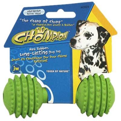 We are the chompions, my friends! We'll keep on chomping til the end! If your dog is a chompion let it try out the Dog Chompion Dog Toy! This rubber dog toy from JW Pet is perfect for a good game of fetch. The Dog Chompion Dog Toy is made from hard natural rubber that is infused with vanilla so that it doesn't have that nasty rubber smell. So let your dog get to chomping with the Dog Chompion Dog Toy! Small/Lightweight: 5" x 1.75" x 4.75" length Jumbo/Heavyweight: 5" x 3.25"x 5"