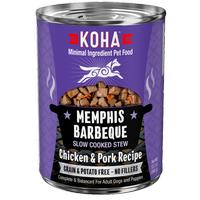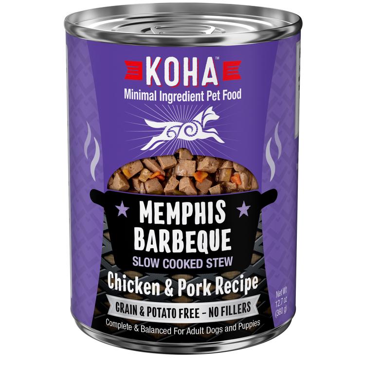 Bring a little music to your dogs taste buds with KOHA Memphis Barbeque! Made with tender chicken and pork, your pup wont be able to get enough of this delectable, slow-cooked goodness. With an 82% moisture content and no grains, potatoes, or fillers, you know your dog is getting only the very best, and it tastes so good you can use it as either a topper or a full meal. The meat is cut into chunks big enough to look like a home-cooked stew for humans while still being a good size for smaller mouths to enjoy, too, making Memphis Barbeque perfect for breeds of all sizes and ages to rock n roll to! Available in 12.7 oz can. Made in the USA.