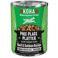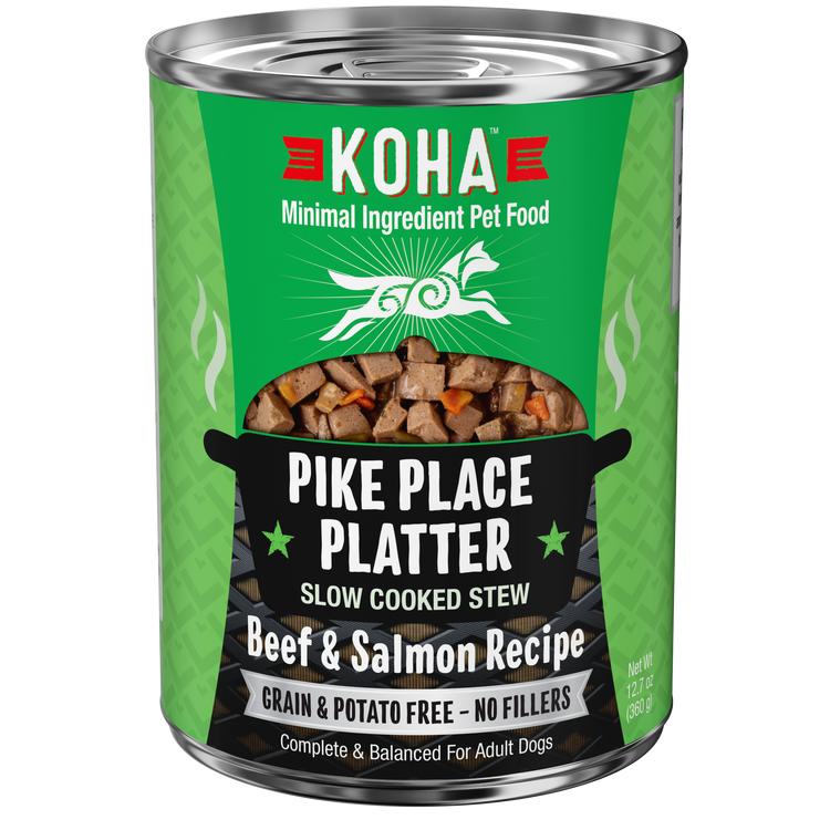 Bring the excitement of Seattles famous Pike Place Market right to your dogs bowl with KOHA Pike Place Platter! Made with tasty trout and savory salmon, your pup won't be able to get enough of this delectable, slow-cooked goodness. With an 82% moisture content and no grains, potatoes, or fillers, you know your dog is getting only the very best, and it tastes so good you can use it as either a topper or a full meal. The meat is cut into chunks big enough to give the feeling of taking a bite of fish fresh from the water while still being a good size for smaller mouths to enjoy, too, making Pike Place Platter perfect for breeds of all sizes and ages!