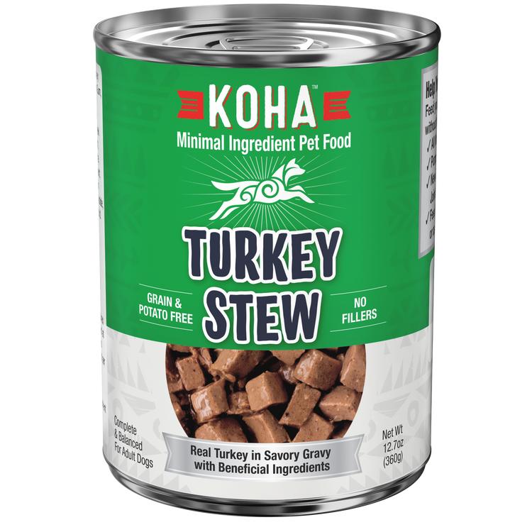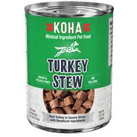 Big, tender chunks of premium turkey marinated in flavorful gravy�our mouths are watering just thinking about it. Unfortunately for us, even though its made from human-grade ingredients, this yummy meal is for dogs only! Designed for rotational feeding, each recipe in KOHAs line of stews features pumpkin to aid digestion and New Zealand mussels for joint health. There are no grains, glutens, or icky fillers, and meat is always the first ingredient. Perfect as a topper or a full meal!
