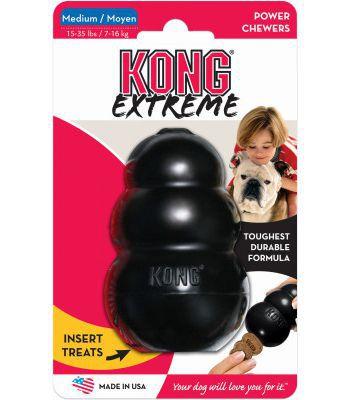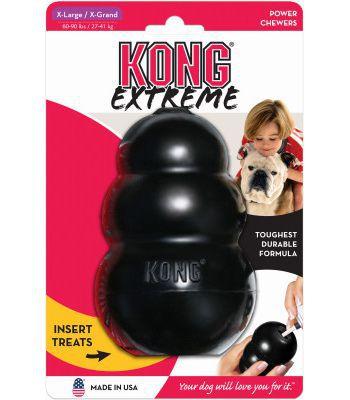 Versatile and tough, every dog loves Kong toys. Heavy chewers need Kong Extreme, the toughest, most durable Kong available. Solid black rubber is designed specifically for dogs who are power chewers. These bouncy toys are great for fetch and are perfect for stuffing with treats (tip: freeze to make treat last longer). A stimulating and rewarding toy your dog will love. Made in the USA from globally sourced ingredients.