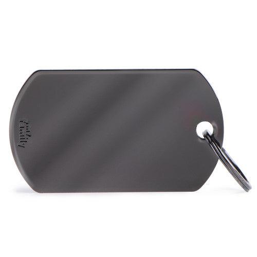 Classic military-style ID tag is made from black brass. This product can be customized with 4 lines on the front and 4 lines on the back. Max 15 characters on each line. The more text you provide, the smaller the font used. Made in Italy.