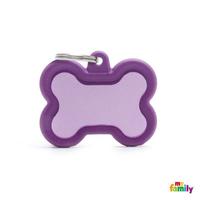 Colorful purple classic bone shape ID tag with rubber edge keeps your pet's info clearly visible, yet quiet - no more jingling tags! Made in Italy.