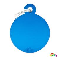 Classic circle ID tag made of blue anodized aluminum. This product can be customized with up to 4 lines on the front and 4 lines on the back. The more lines of text provided, the smaller the font will be. In the Box Below - the 1st 4 Lines will be used for the front of the tag and the last 4 for the back.