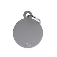 Basic large gray circle ID tag made of aluminum. This product can be customized with up to 4 lines on the front and 4 lines on the back. The more lines of text provided, the smaller the font will be. In the Box Below - the 1st 4 Lines will be used for the front of the tag and the last 4 for the back.