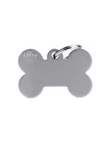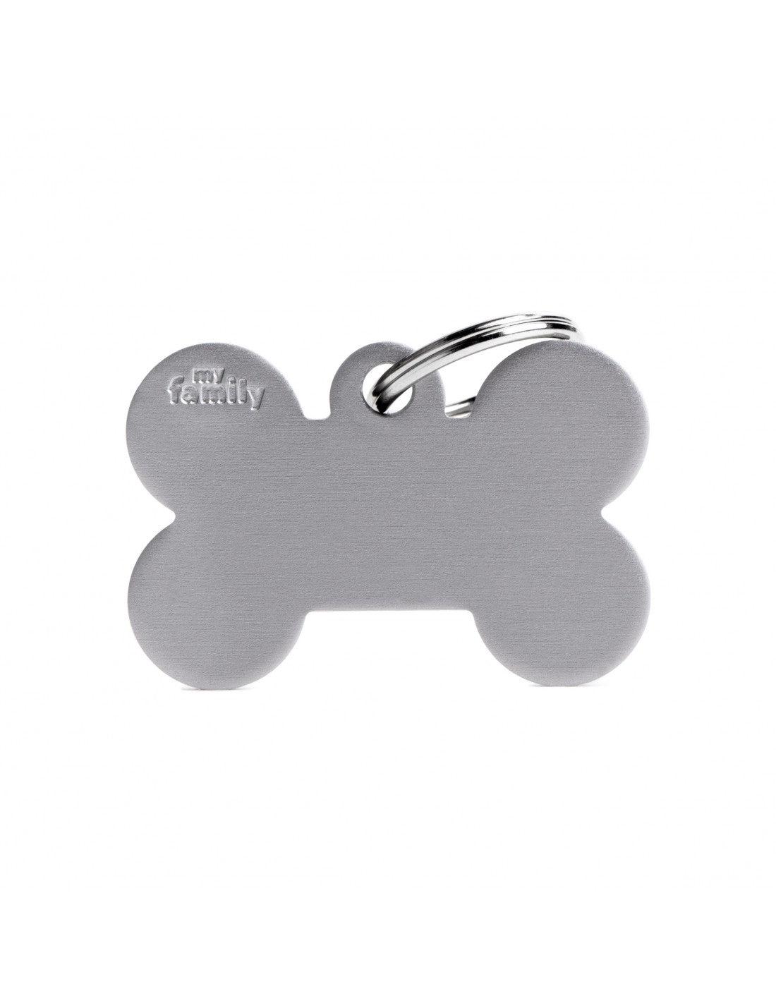 Classic bone-shaped ID tag in grey color, perfectly sized for bigger dogs. Rugged and ready to engrave to keep your pet's information clearly visible. Made in Italy. Approx. size: 1.8 x 1.3"