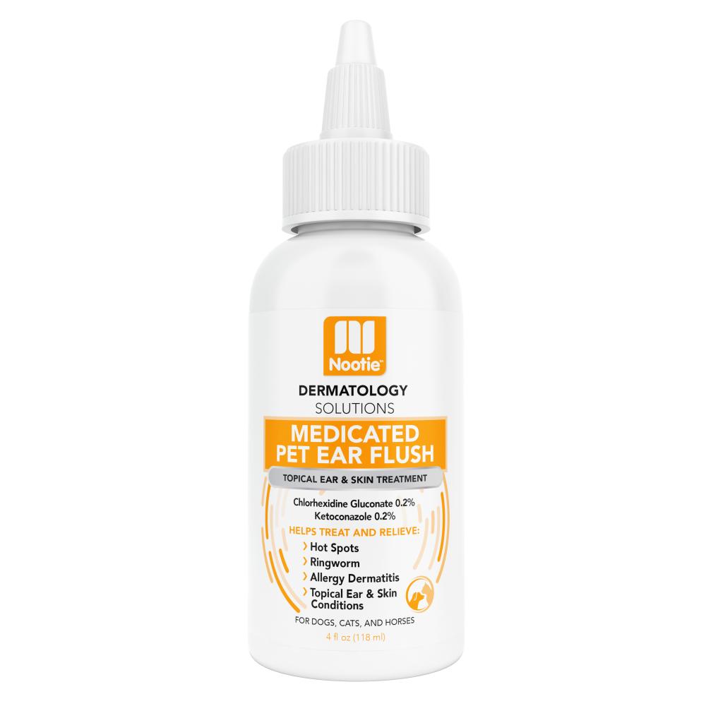 The Medicated Pet Ear Flush by Nootie is a topical ear and skin treatment that is safe for cats and dogs. Formulated with veterinarian-strength active ingredients, this product can help treat and manage hot spots, ringworm, allergy dermatitis, and other topical skin and ear conditions. This ear flush is lightly scented with non-irritating ingredients and comes in a 4 fl oz squeezable bottle.