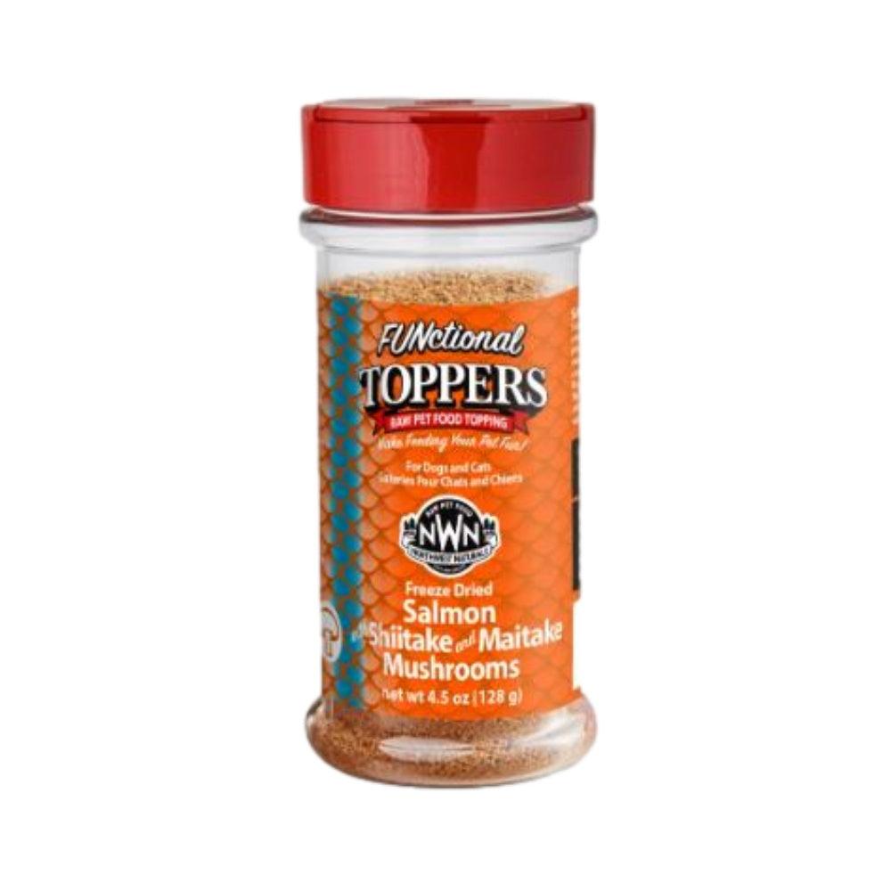 Add flavor and nutrition to your pup's bowl with Northwest Naturals Salmon with Shiitake and Maitake Mushrooms topper. Shiitake mushrooms are high in vitamin B, and support heart health, improve energy levels and brain function. Maitake mushrooms help support immune health. Savory salmon provides protein and a savory and satisfying taste. Available in 4.5 oz. container.