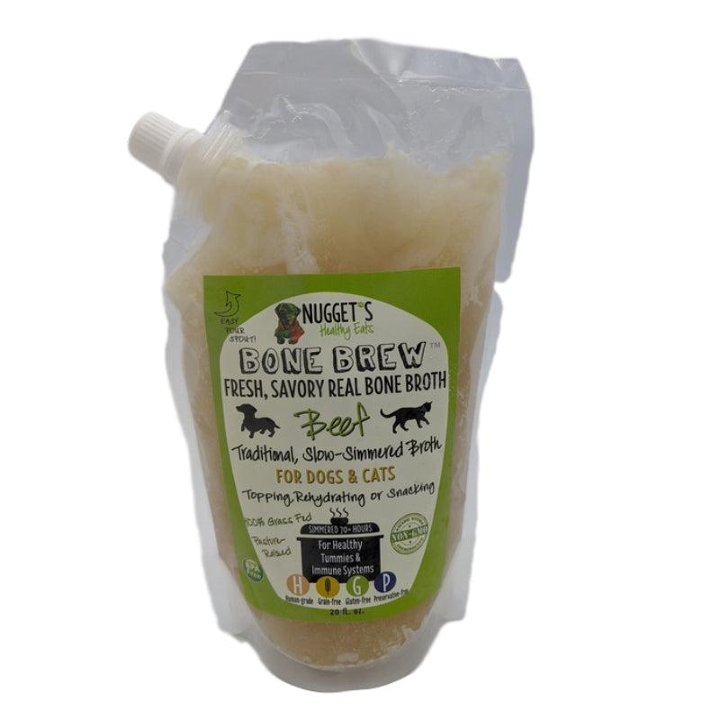 A savory boost of nutrition, Beef Bone Brew from Nugget's is perfect as a healthy snack or food topper, adding protein, amino acids and gelatin to your pet's diet. Nugget's sources proteins from animals humanely raised on organic, open pastures, using only the premium knuckle & marrow bones for the healthiest and tastiest bone broth. Brews are made by slow roasting, then simmering bones for over 30 hours with apple cider vinegar and purified water, then adding ginger and turmeric. Broth is then frozen immediately to retain the nutrition and taste. The result is a delicious snack your dog will absolutely love. Thaw in refrigerator and serve as a healthy snack, or warm slightly for a nourishing drink or food topper to entice picky pets. A delicious way to support your dog's digestion, coat, bone and brain health. 20 Fl. oz.